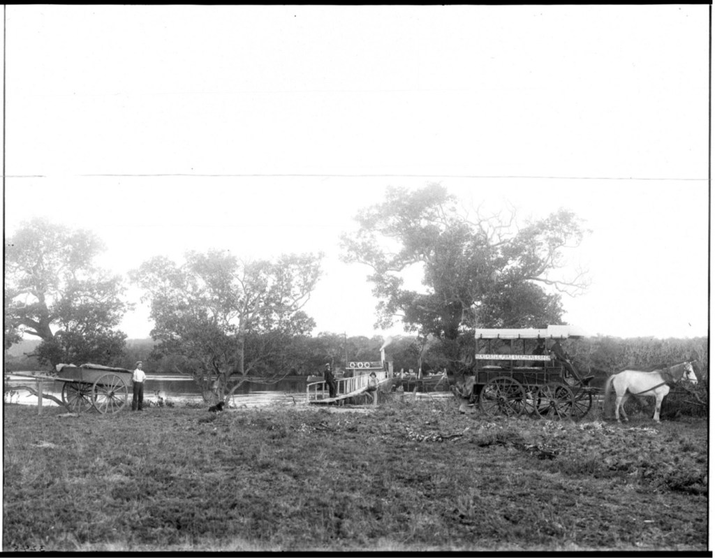 A coach from Stockton delivering travellers to a steam launch at the Salt Ash wharf, on Tilligerry Creek, 1907. The sign on the side of the coach reads: Newcastle Port Stephens Coach – Leaves Stockton Wharf Tuesday and Friday.