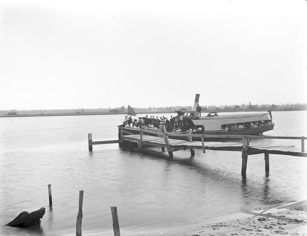 Steamer ‘Rose’ bringing picknickers to Tomago, showing the rickety state of the wharf. [University of Newcastle Library]