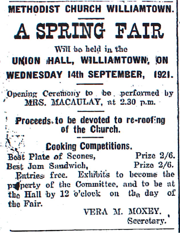 A Spring Fair was held in the Union Hall at Williamtown on 14 September 1921 to provide funding for the re-roofing of the Church.