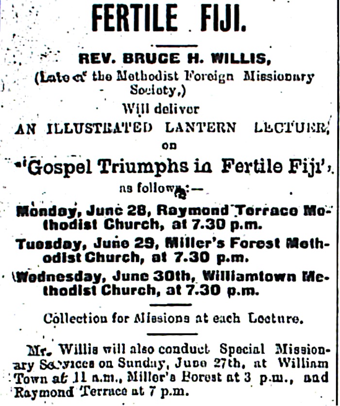 Advertisement for an illustrated lantern lecture and special missionary services to be held at the William Methodist Church [Raymond Terrace Examiner and Lower Hunter and Port Stephens Advertiser, 25 June 1920]
