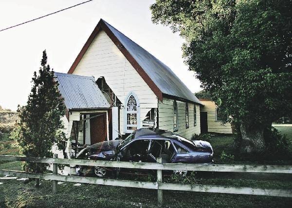 “A man was in a critical condition in hospital last night after a car he was driving ran off Nelson Bay Road at Williamtown and crashed into a church. …. Police said the car was heading toward Newcastle when it ran off the road about 3pm. It narrowly missed a pole and a large tree before colliding with the Uniting Church building. The front and driver side of the car hit the weatherboard building, snapping off its entrance area and gouging a large hole in its facade. Police said no one was in the church at the time.”