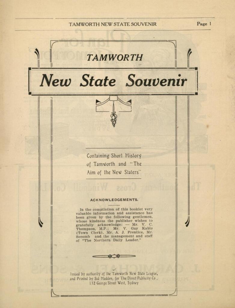 ‘Tamworth “Daily Observer” has entered upon a campaign in support of the separation movement aiming at the creation of a new State comprising the northern portion of New South Wales. The question has been raised before, but in an isolated way, and the object of the “Observer” is now to concentrate the thought and effort of the whole of the North, North-western and North Coast districts upon the creation of an entirely new State (which would be about the same size as Victoria) and give the lead to other localities throughout Australia, which will perhaps be inspired to make a similar move, and thus bring about a complete revision of the system of government and development throughout the Commonwealth.