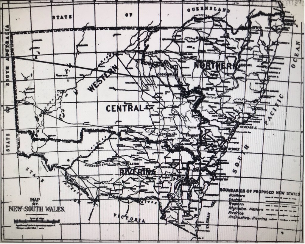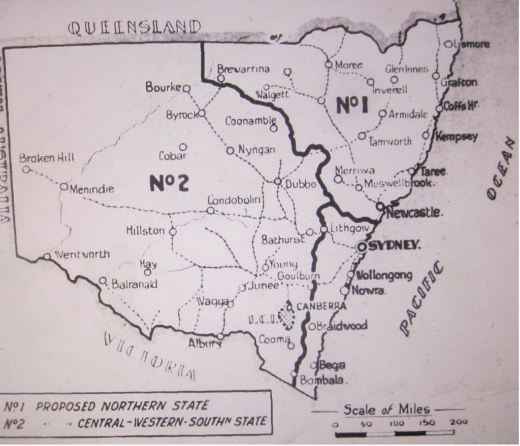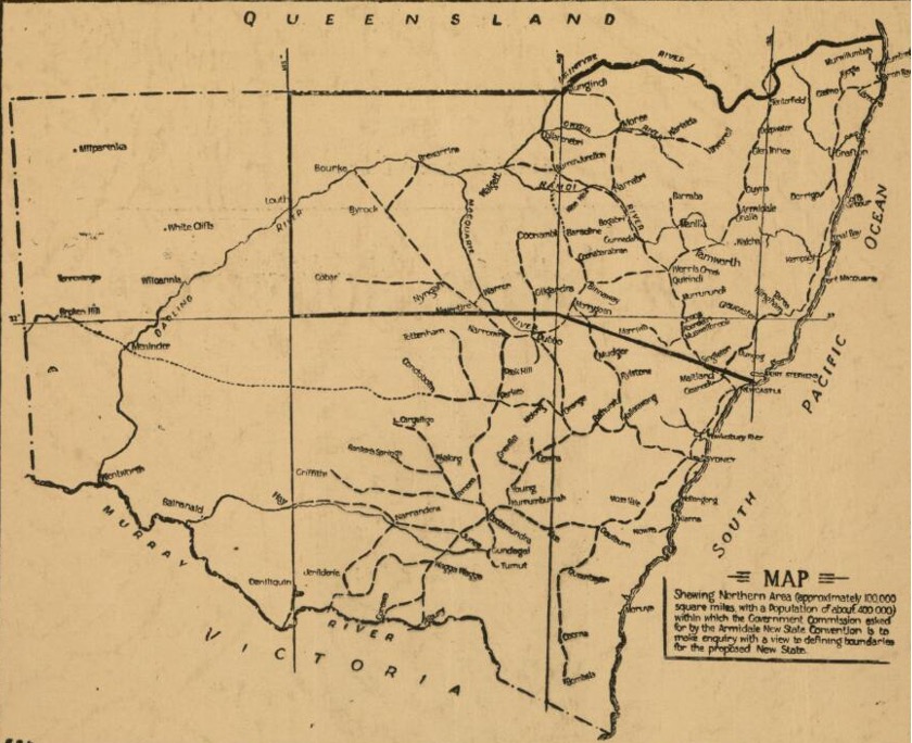 ‘Mr. Sinclair, who was a member of the Royal Commission, put forward an earnest plea that members face a hitherto neglected question— that of the boundaries of the proposed New State. The absence of a definitely defined area, or even the haziest idea as to what should constitute that area, was particularly noticeable among the witnesses before the commission. He claimed that there was no need to saddle the New State with the area of country west of Bourke, with all its non-paying railway lines. There was no demand among the residents of that district as a whole for inclusion in the New State, and that was another fact very evident from the tenor of the evidence of the witnesses examined. The question had been asked, and he thought with justice. Would the man from Bourke or Dubbo be any more in touch with the men of Murwillumbah or Lismore if they formed part of a new State than they were in touch with the present administration, and of what advantage would it be to them to be in touch with the North Coast areas?