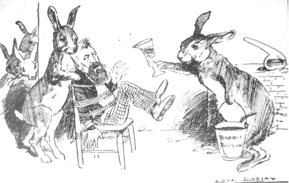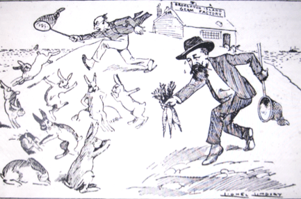 Trusting that the rabbit of Broughton Island won’t administer a dose of his famous rabbit exterminator to Dr. Danysz. Cartoon by Lionel Lindsay [Evening News, 10 November 1906, page 10]