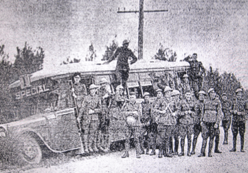 Troops alighting from a bus after having been transported from Rutherford to Port Stephens [Newcastle Morning Herald and Miners’ Advocate, 7 October 1938, page 11]