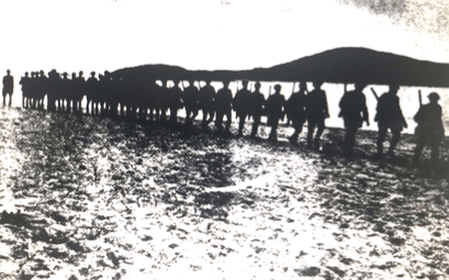 “Dawn Silhouette”. Troops marching along the Fingal Beach shore preparing to go into action to repel the “invader” from the sea [Newcastle Sun, 7 October 1938, page 8]