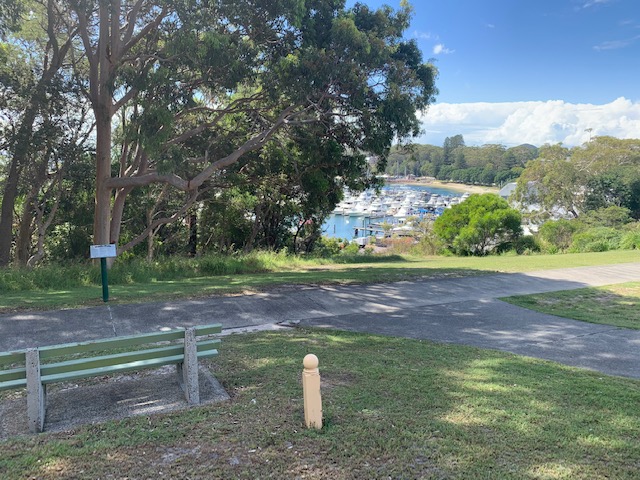 Location of the “Bridal Path’ overlooking Nelson Bay with its signage and ‘Nelson Bay Heritage Walk’ marker No 6 in the foreground [Author photo – April 2023]