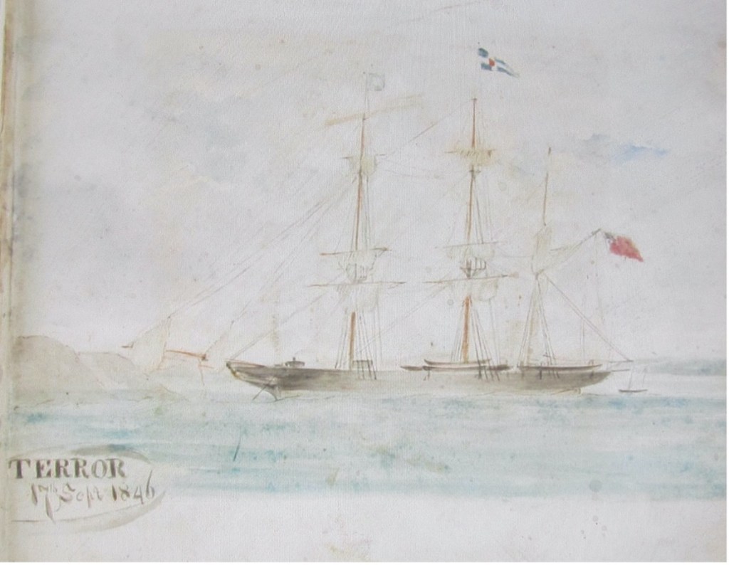 Illustration of the barque ‘Terror’ (dated 17 September 1846) which was one of many whaling ships that entered Port Stephens for repairs and provisions [Australian National Maritime Museum]