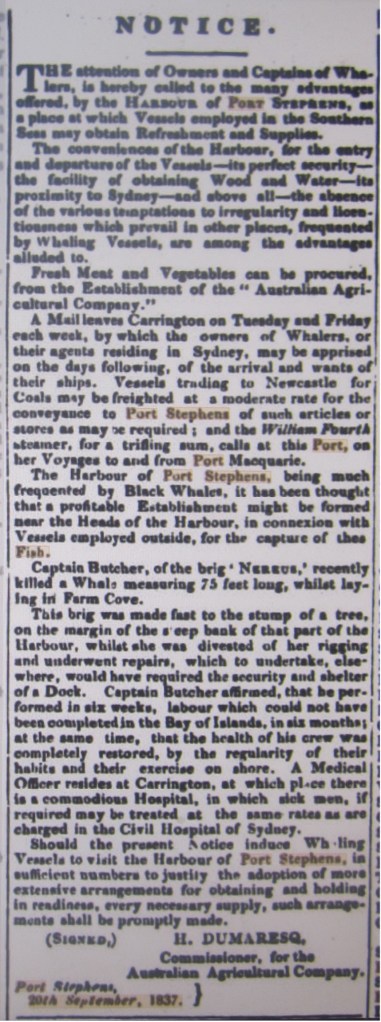 ‘The attention of Owners and Captains of Whalers is hereby called to the many advantages offered by the Harbour of Port Stephens, as a place at which Vessels employed in the Southern Seas may obtain Refreshment and Supplies.