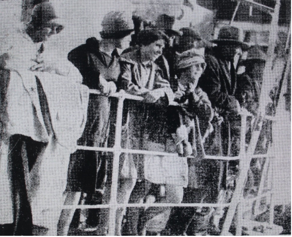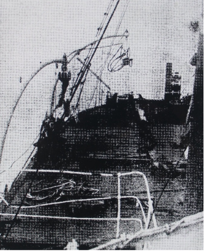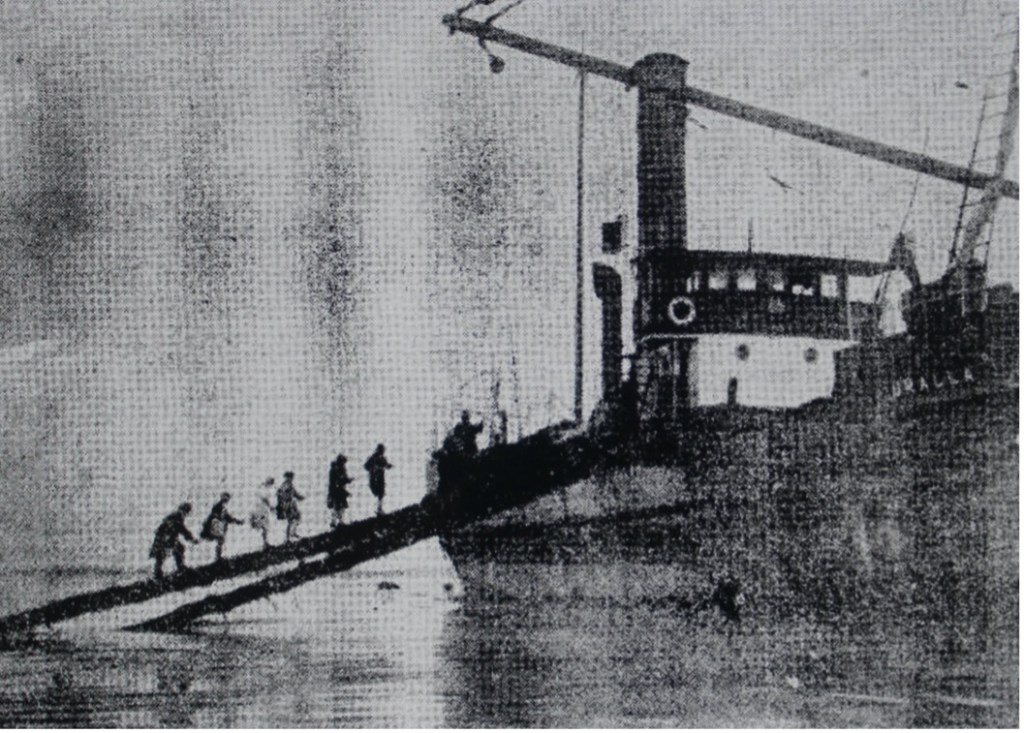 Visitors go aboard the wrecked ‘Uralla’. The improvised gangways seen on the left of the picture consist of logs taken from the ship’s cargo.