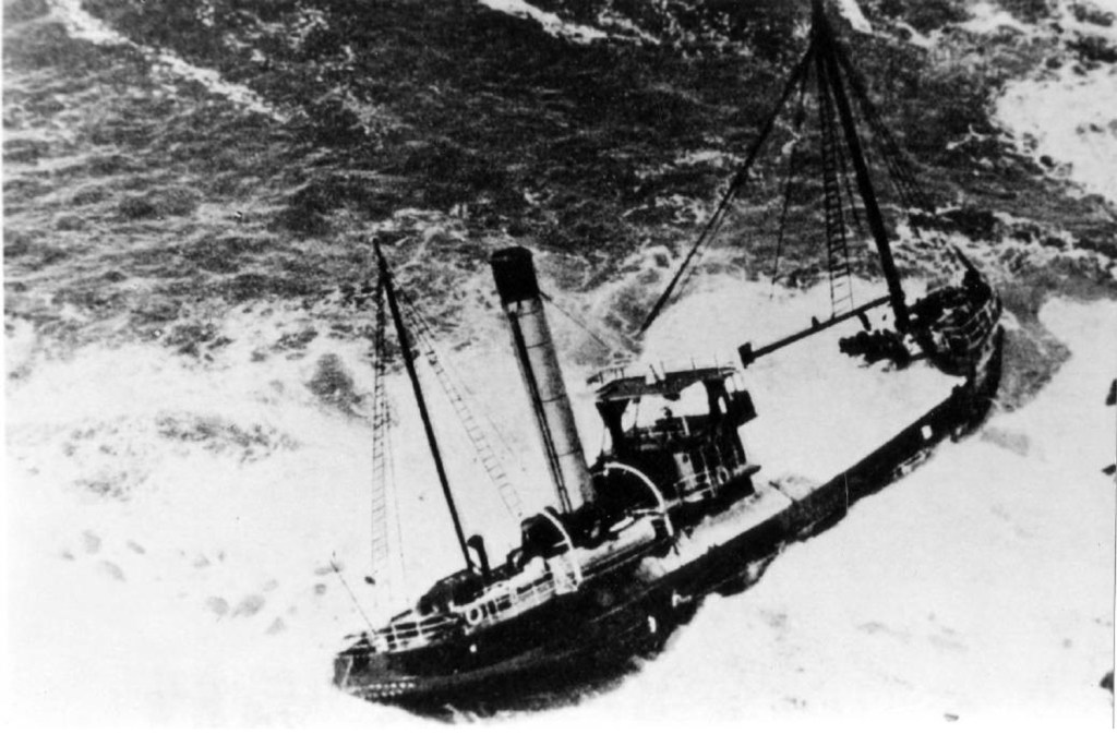 Despite all these activities, the vessel has not been moved from its original position taken up after drifting on the shore. Owing to the shortage of coal, hundreds of palings, portion of the ship’s cargo, have been burnt in order to keep up steam for the winches. Three sand pumps have been placed in position to meet any inrush of water that may arise if the vessel is floated. Cement is being used to stiffen the bottom of the vessel and make it as water-tight as possible. Efforts were again to be made at high tide last night to refloat the vessel.’