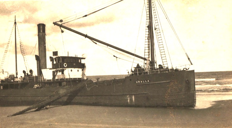 ‘Hopes are expressed that the steamer ‘Uralla’, which went ashore during a cyclonic storm last June, may yet be drawn from her sandy bed at Morna Point. On account of the heavy weather at the weekend, the clamps holding the hawsers moved, and allowed the vessel to turn stem on to the sea. Her propellers are now in approximately 13ft of water, and when the weather abates an attempt will be made to tow the ‘Uralla’ stem first to sea. By some chance the sea cocks of the vessel opened during the weekend, and the engine room was flooded. This tended to hold the ship firmly on the sand, and certainly prevented her being pounded to pieces in the terrific surf.’