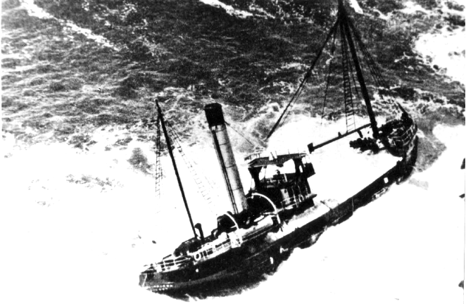 But for Jervie’s action, the crew might have gone down with the ship. Seeing that within a few moments the steamer might take its long plunge to the bottom, taking with it every man on board, he plunged overboard. The broken port boat provided a support in the boiling seas, and he made the lighthouse island. On the boat stood 16 haggard men with life-belts on. They stood by after the captain had shouted “every man for himself,” waiting for the end.