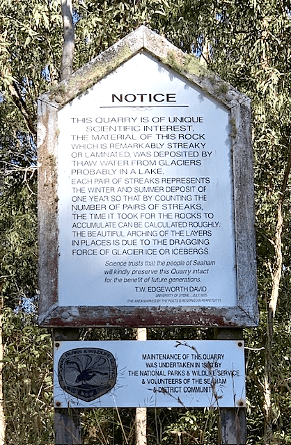 The [notice] board marking the portion dedicated at the quarry, bears the following inscription: “This quarry is of unique scientific interest. The material of this rock, which is remarkably streaky, or laminated, was deposited by thaw waters from glaciers, probably in a lake. Each pair of streaks represents the winter and summer deposits of one year, so that by counting the number of pairs of streaks the time it took for the rocks to accumulate can be calculated roughly. Science trusts that the people of Seaham will kindly preserve this quarry intact for the benefit of future generations.” The signature of Professor T. W. E. David, of the University of Sydney, is attached at the foot of the notice.’