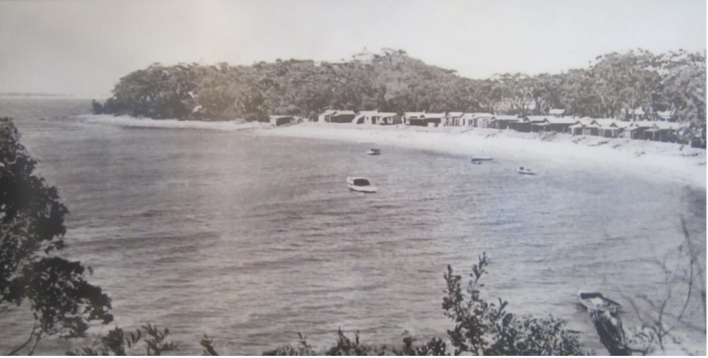If you visited Little Beach at Nelson Bay in 1950, apart from the Inner Light House which was visible on top of the adjacent hill, a military wharf in the centre of the beach and numerous huts, of varying design, were the prominent features.