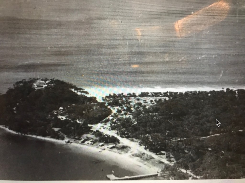Aerial view of Little Beach in 1950 – the wharf and several of the huts are visible with the Inner Lighthouse on top of the hill and the Halifax Park camping area at its base
