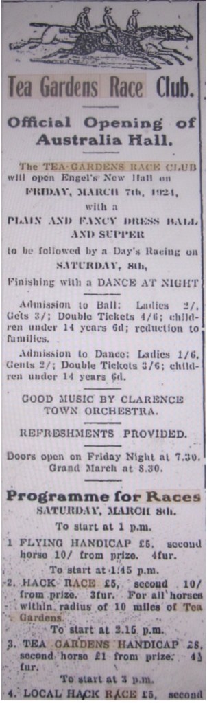 On Friday 7 March 1924, the Tea Gardens Race Club held the official opening of the Australia Hall at Tea Gardens. It was the start of a big weekend with festivities including a ball and supper in the new hall that evening to be followed by a big day of horse racing on Saturday 8 March, concluding with a dance that night.