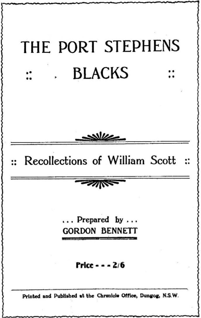 The Dungog Chronicle: Durham and Gloucester Advertiser also published a booklet titled ‘The Port Stephens Blacks, Recollections of William Scott’ in 1929, which was based on the articles published in the newspaper. The foreword to the book, as prepared by Gordon Bennett, is set out below: