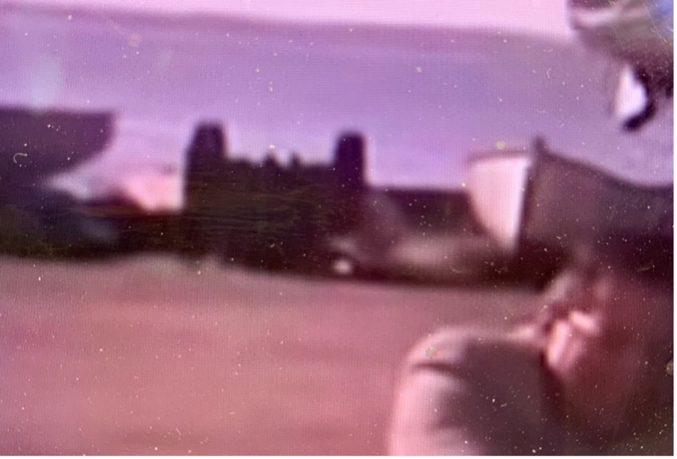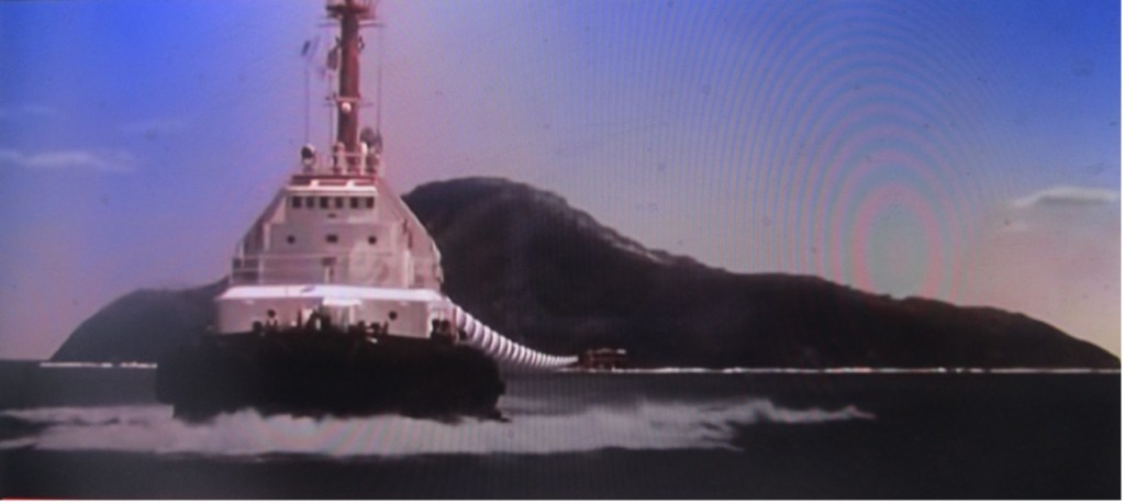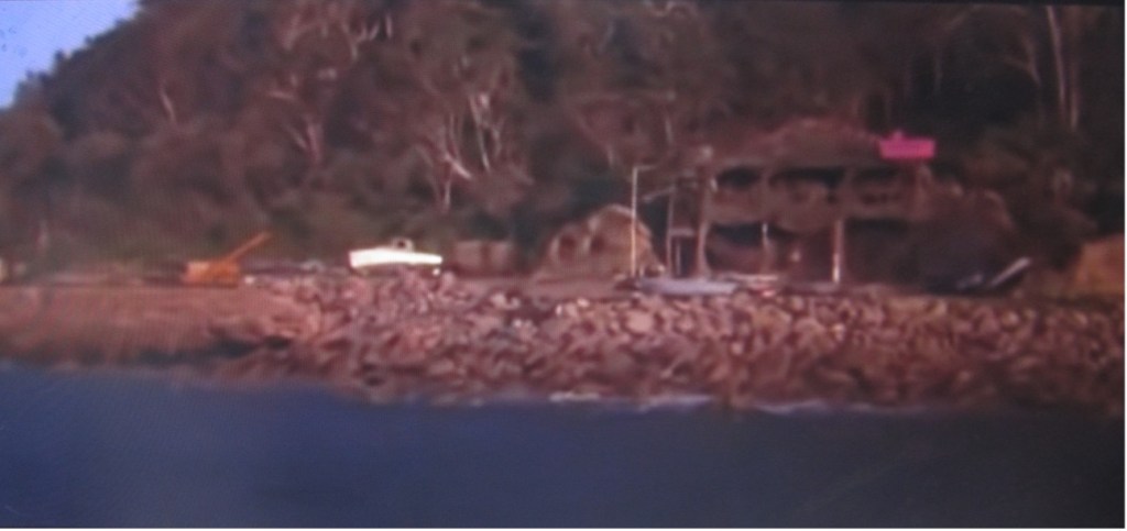 Screen shot: The movie set at the base of Mount Tomaree, with the ‘Tomaree torpedo tube’ to the left of the photo near the yellow crane