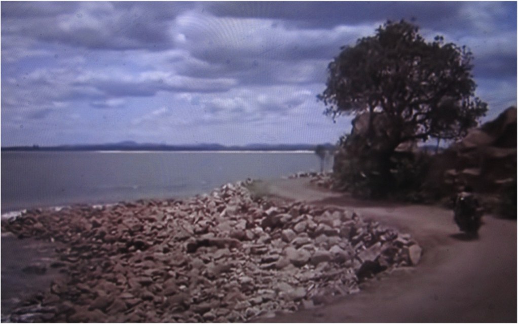 Screen shot: Reckless Kelly riding his motorbike (centre right) on the access road to Tomaree Head with Port Stephens in the background