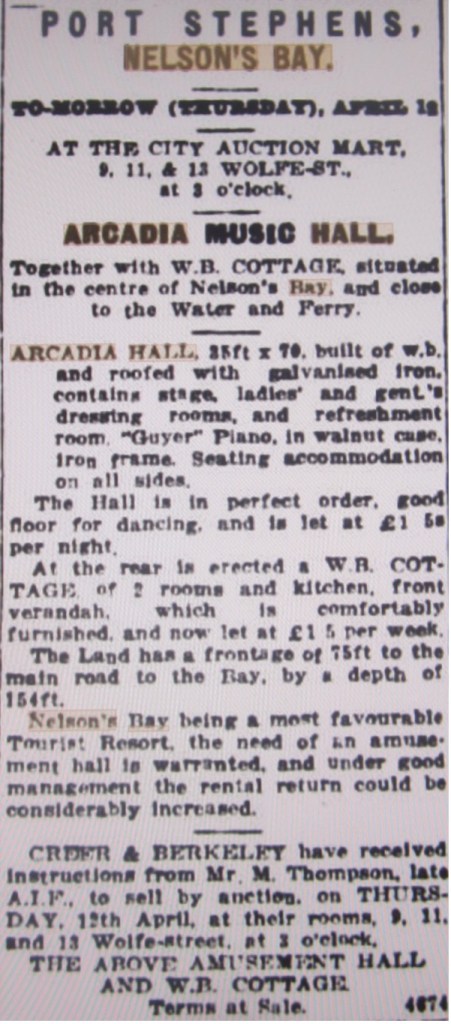 ARCADIA HALL, 36ft x 70, built of w.b. and roofed with galvanised iron, contains stage, ladies’ and gent’s dressing rooms, and refreshment room. “Guyer” Piano, in walnut case, iron frame. Seating accommodation on all sides. The Hall Is in perfect order, good floor for dancing, and is let at £1 5s per night., At the rear is erected a W.B. cottage, of 2 rooms and kitchen, front veranda, which is comfortably furnished and now let at £1 5 per week. The Land has a frontage of 75ft to the main road to the Bay, by a depth of 154ft. Nelson’s Bay being a most favourable Tourist Resort, the need of an amusement hall is warranted, and under good management the rental return could be considerably increased. CREEER & BERKELEY have received instructions from Mr. M. Thompson, late A.I.F., to sell by auction, on THURSDAY, 12th April, at their rooms, 9, 11, and 13, Wolfe-street, at 3 o’clock, THE ABOVE AMIUSEMENT HALL AND W.B. COTTAGE. Terms at Sale.’