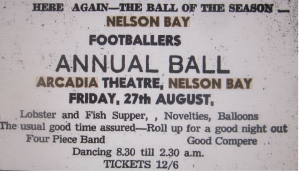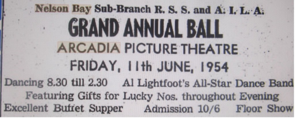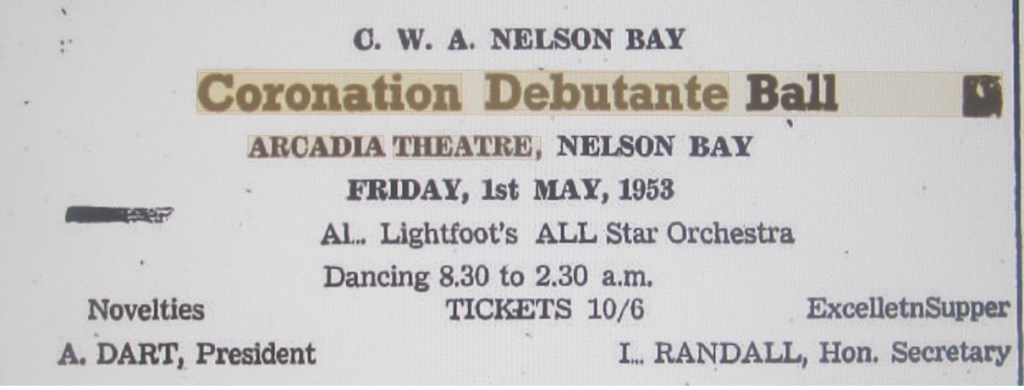 ‘A most successful Debutante Ball was held by Nelson Bay Branch of the Country Women’s recently in the Arcadia Theatre, Nelson Bay. Al. Lightfoots Orchestra played to a capacity house, the attendance being over 400. Mr. Cyril Daley was general Master of Ceremonies and carried out his duties with great enthusiasm. During the presentation of Debutantes Mr. Reg Francis spotlighted each person during their promenade down the hall.