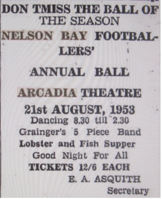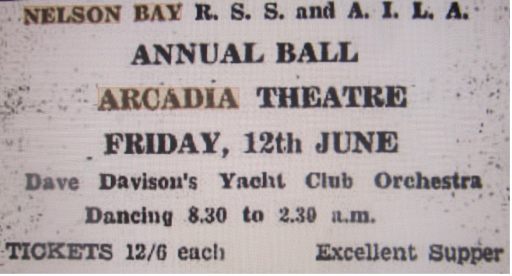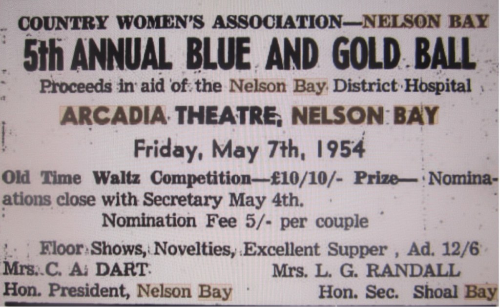 The first annual hospital ball was held in the Arcadia Theatre, Nelson Bay, on October 9th. The ballroom was tastefully decorated with large bowls of pink and white flowers and approximately 250 couples were present. The music was supplied by the Graingers’ Dance Band and novelty dances were arranged throughout the evening. A floor show was produced by John Laman and added to the attractions of the night. A poultry and lobster supper was served in St. Michael’s Hall during the evening.’