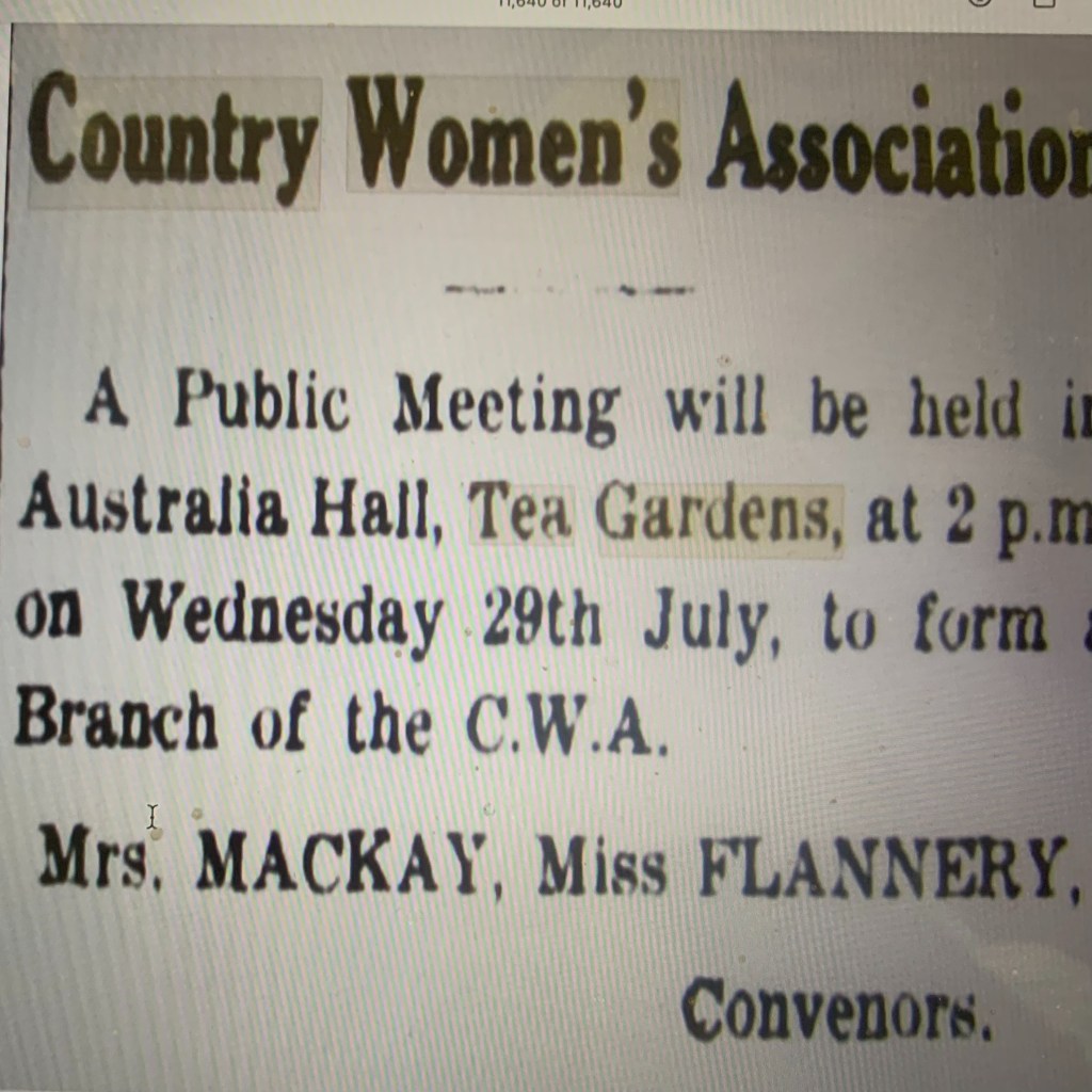 ‘Wednesday afternoon, 29th ult, was notable in the social life of Tea Gardens, when a branch of the Country Women’s Association was formed, as the result of a recent visit by Miss Flannery, President, Stroud C.W.A. and the cooperation of Cr. W. F. Harris (Stroud Shire). The provisional president (Mrs. W. Ripley) and secretary (Mrs. Jenkins) were reappointed.