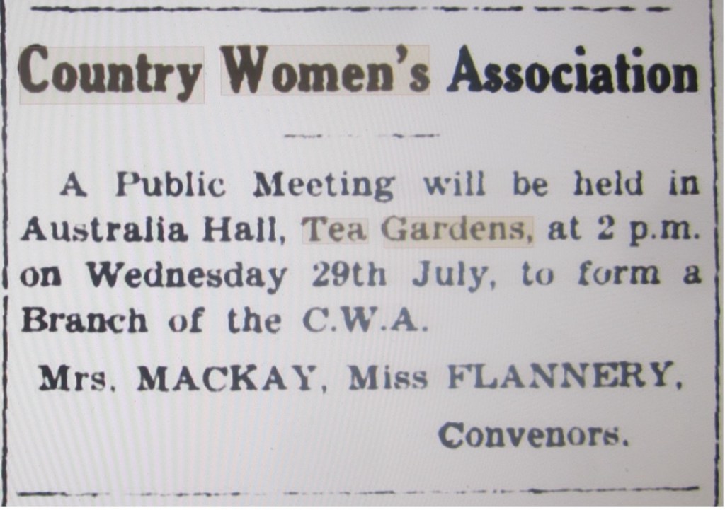 ‘Consequent upon the recent visit of Miss Flannery, President Stroud C. W. A. to Tea Gardens, arrangements were made through Cr. Harris for the purpose of deciding whether a branch of the C.W.A. should be formed. Mrs. Ripley arranged for a meeting which was held in Australia Hall on the 28th ult., and was largely attended.