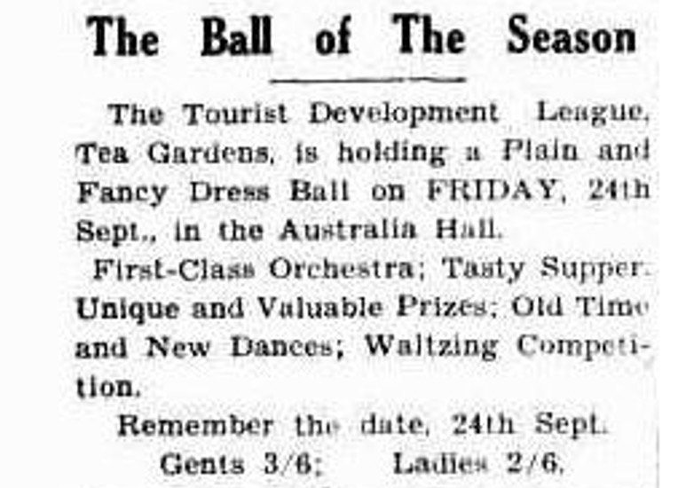 ‘Tea Gardens continued its celebrations in a grand civic ball at night, when some 200 couples crowded Into the Australia Hall. They included many visitors from Newcastle, Bulahdelah, Stroud, Bungwahl, Booral, Karuah, Clarence Town, Dungog and other parts. The ball was under the auspices of Stroud Shire Council, Cr. Zeininger (shire president) presiding.