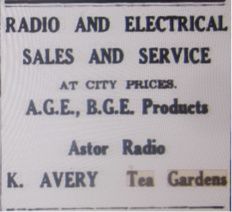 ‘Mr. Ken Avery will shortly open the doors to a new business in Tea Gardens. It will be a radio and electrical sales and service station. Ken has also taken over the Tea Gardens Picture show.’