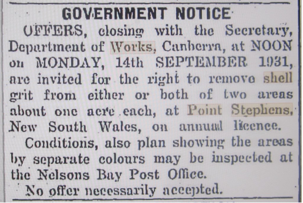 ‘The Public Works Dept. is inviting tenders in this issue for the right to remove shell grit from Point Stephens. Particulars can be seen at Nelsons Bay post office.’