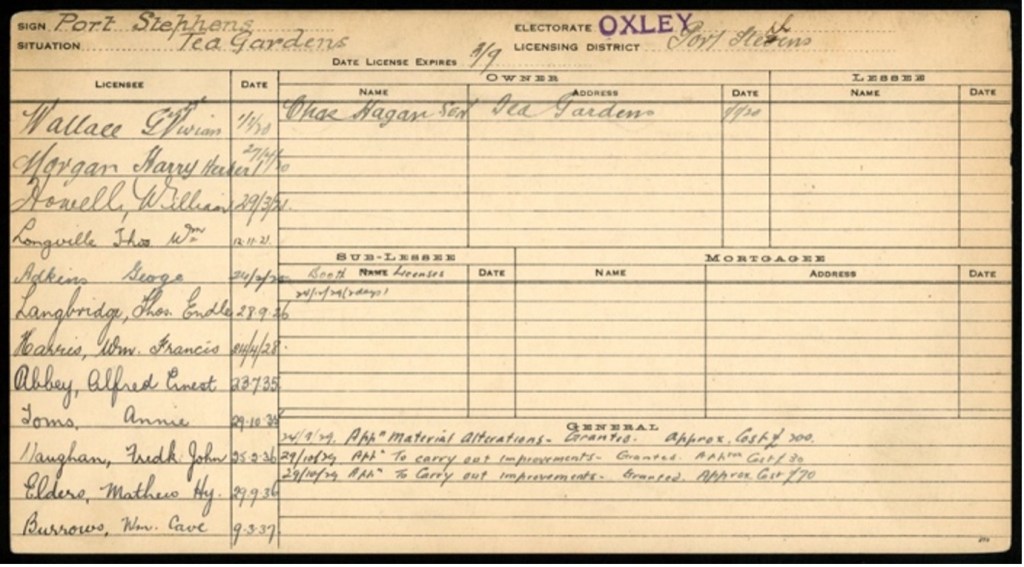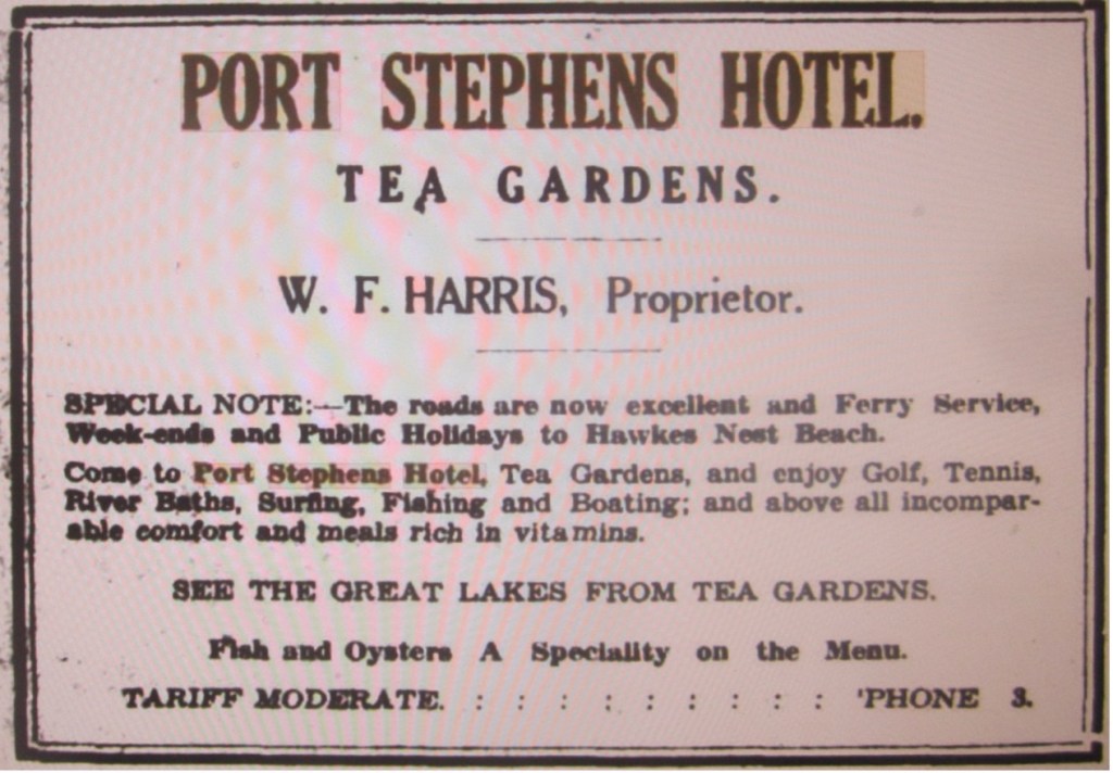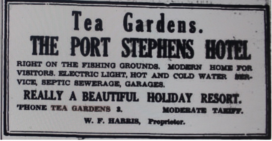 ‘Mr. W. F. Harris, licensee of the Port Stephens Hotel, Tea Gardens, announces that he is retiring as licensee of the Port Stephen’s hotel as from July 23. The application for the transfer of the premises will come before the licensing Court this week. His prospective successor at the popular hostelry will be Mr. A. E. Abbey, who has been a frequent visitor to Tea Gardens over a number of years.