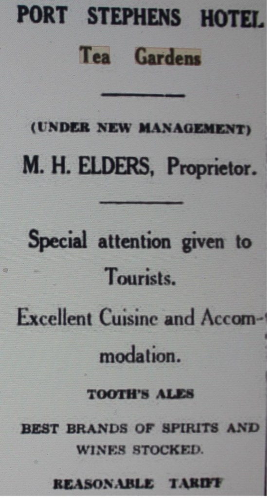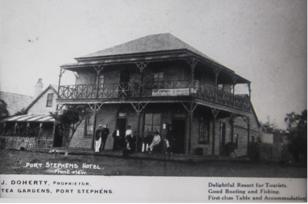 ‘This [the Port Stephens Hotel] was first built in 1884 as a wine saloon for Mr. C. Hagon. In 1887 it was added to and made into the Port Stephens Hotel. Other hosts since that time have been Messrs W. Thomas, Barney Dougherty, J. Dives, Wallace, Hennessey, Bushman, Akins, Langbridge, W. F. Harris, J. Vaughan, and at present M. H. Elders who is keeping up the good name of the hotel. From time to time the hostelry has been changed and rebuilt and is now a two storey building with electric light, up-to-date bathrooms, hot water service, and all modern conveniences installed. Mr. Witt had the Tea Gardens Hotel in the early days and there was also an hotel at Hawks Nest and the names of Messrs J. Kinnaird and Stewart Smith are well remembered as hosts of this hotel.’