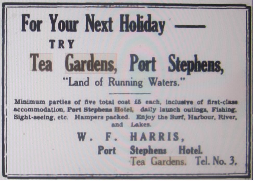 ‘In my opinion, Port Stephens is about the best place to spend a holiday. The way to reach it is by boat either from Sydney or Newcastle. ……. Proceeding further up the river is a very nice, healthy town ship called Tea Gardens, the population numbering about 300 in all, principally timber workers. There are two hotels here and two stores. The cost of the holiday would depend on the length of stay, and if boarded or not. Board and residence can be obtained for £1 per week.’