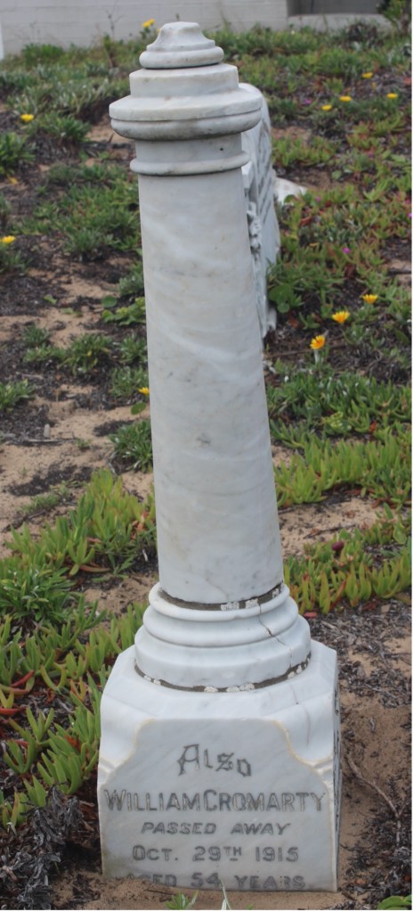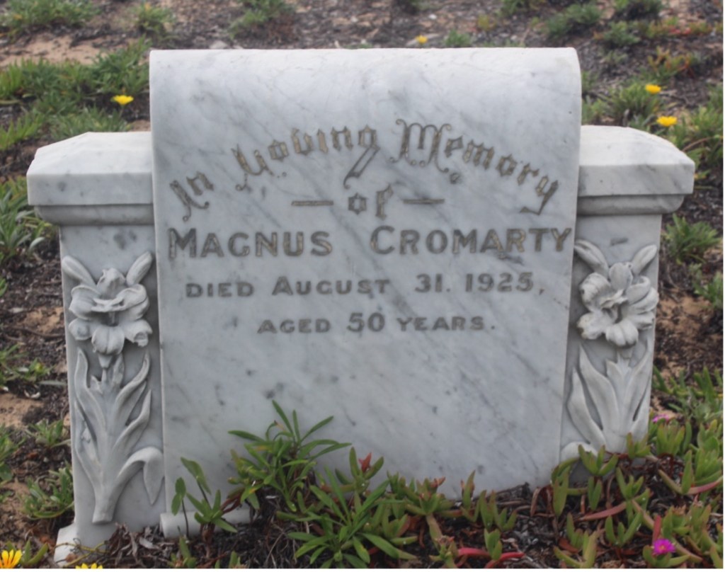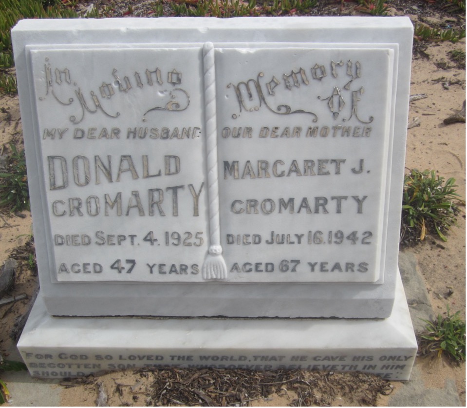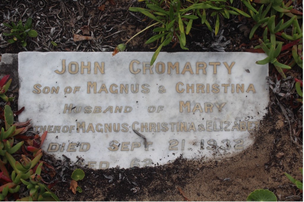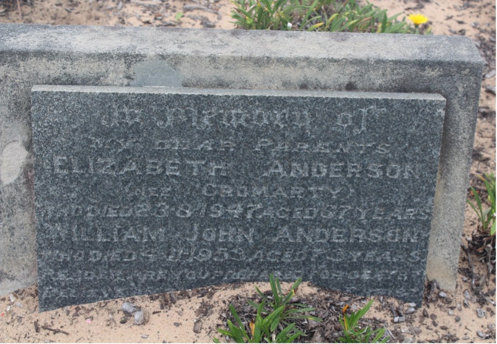 ‘Mrs. Elizabeth Anderson died at Bob’s Farm, Port Stephens, at the age of 67. She was a daughter of Mr. and Mrs. Magnus Cromarty, who lived at Soldiers’ Point and Bob’s Farm, and a granddaughter of Captain James Cromarty, one of the pioneers of Port Stephens. Before going to Port Stephens, Captain Cromarty was Harbour Master at Newcastle. After his retirement, as the result of injuries caused by his being jammed between two vessels, he was given a grant of land at the head of Karuah River, on what is now known as Cromarty Creek. While at Soldiers’ Point, he was asked by Newcastle harbour authorities to salvage a boat which had drifted ashore on Anna Bay Beach. In an attempt to secure the boat. he and his son, William, were drowned in the surf. Later, portion of Captain Cromarty’s body was found, but his son’s body was never recovered. A few years ago, Newcastle Historical Society had the tombstone in the cemetery at Carrington, Port Stephens, repaired and reengraved. Mrs. Anderson, who was born at Kilery, is survived by her husband, one son, Mr. W. J. Anderson (Bob’s Farm) and one daughter, Mrs. D. Trotter (Maclean) Messrs. James Cromarty (Nelson’s Plains) and Neil Cromarty (Bob’s Farm) are brothers, and Mrs. E. Upton (Bob’s Farm) a sister. The funeral was to Anna Bay cemetery, where Rev. D. Trotter officiated.’