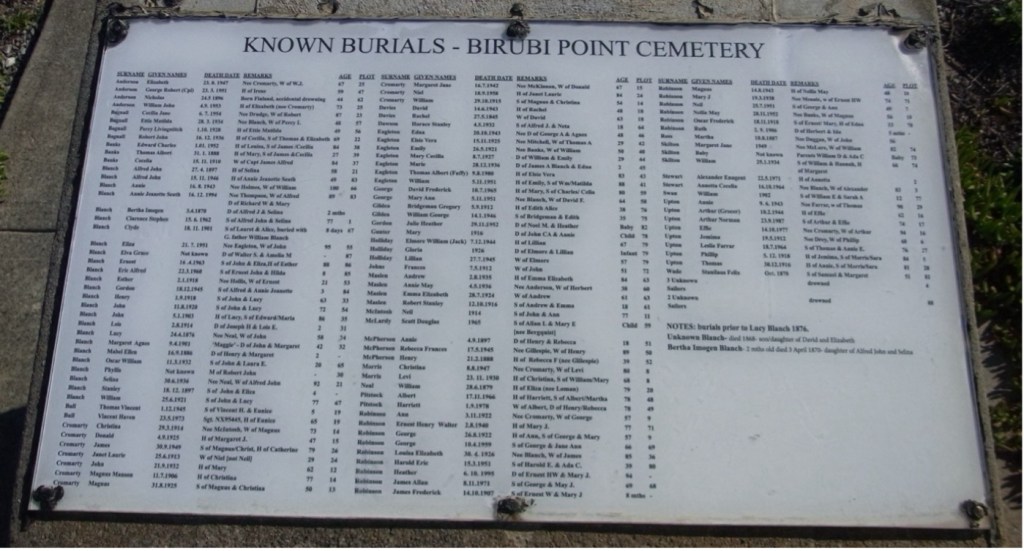 The following list of the deceased buried in the cemetery is obtained from a plaque of ‘Known Burials – Birubi Point Cemetery’ located on a plinth at the cemetery.