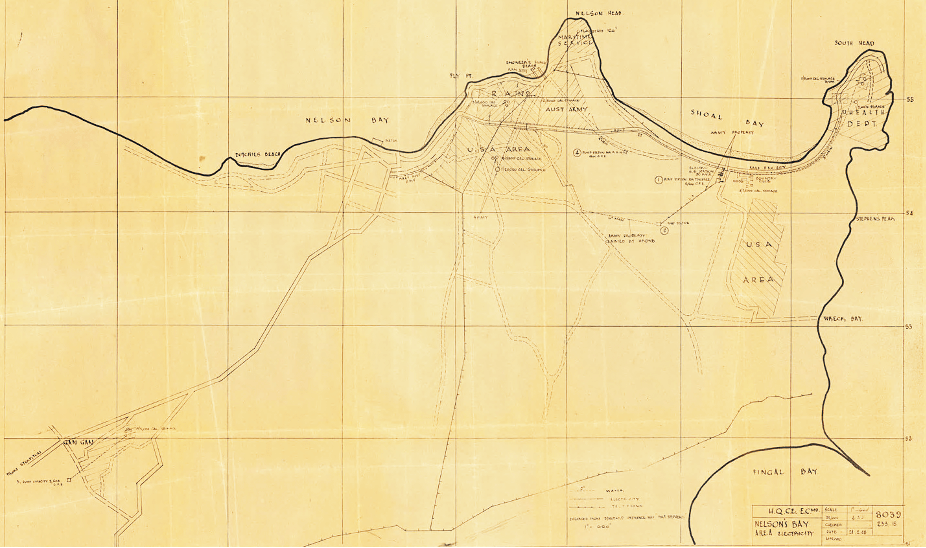 Map dated 24 February 1948 showing locations of HMAS Assault marked as R.A.N; U.S.A. area occupied by the United States Landing Force Equipment Depot; and Gan Gan (at the bottom left of the map) [University of Newcastle Library – Living Histories Collection].