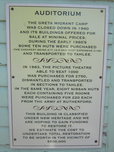 Signage attached to the Auditorium summarising the history of the Greta Migrant Camp buildings relocated to the Tahlee YWAM site [Author photo – 2014]