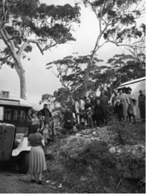 A group of Dutch settlers arrive at Nelson Bay from Bathurst. They will be allocated to accommodation units and provided with towels, linen etc. from hostel section office at rear.