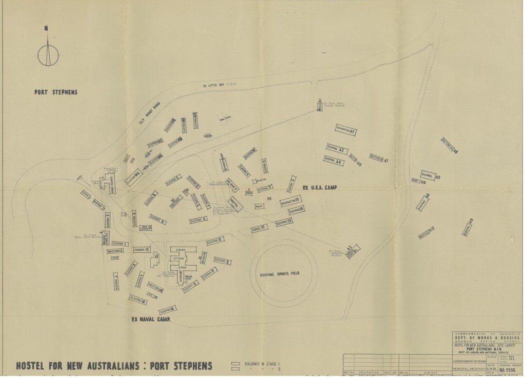 Plan of the Nelson Bay Migration Hostel – 6 October 1949. It shows the facilities of the former HMAS Assault military camp at Fly Point, that were to be used for the migrant hostel. [National Archives of Australia]