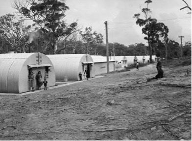View of the Nelson Bay Migrant Hostel in 1950, showing the recently installed Nissen huts that extend towards Little Beach. Today the area has reverted to bush. The Inner Lighthouse is in the foreground.