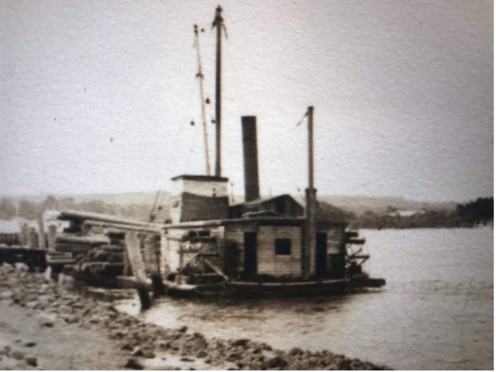 A flat-bottomed drogher at Tea Gardens loaded with timber