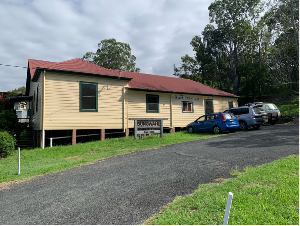 Bungwahl Community Hall c 1914 at the top of a steep incline from the wharf [Author Photo – March 2024]