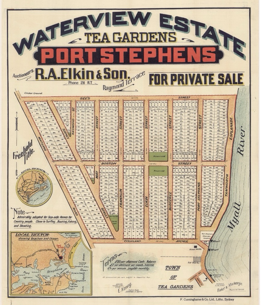 The estate plan for the second portion of the Waterview Estate’ land development at Tea Gardens, marketed by R. A. Elkin & Son [State Library NSW]