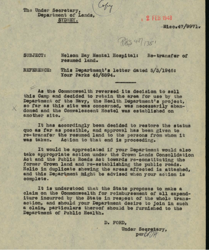 The planned Mental Hospital Facility was abandoned by the NSW Government in February 1948, when the Commonwealth Government reversed its previous decision to sell the former military site and retain it for use by the Royal Australian Navy.