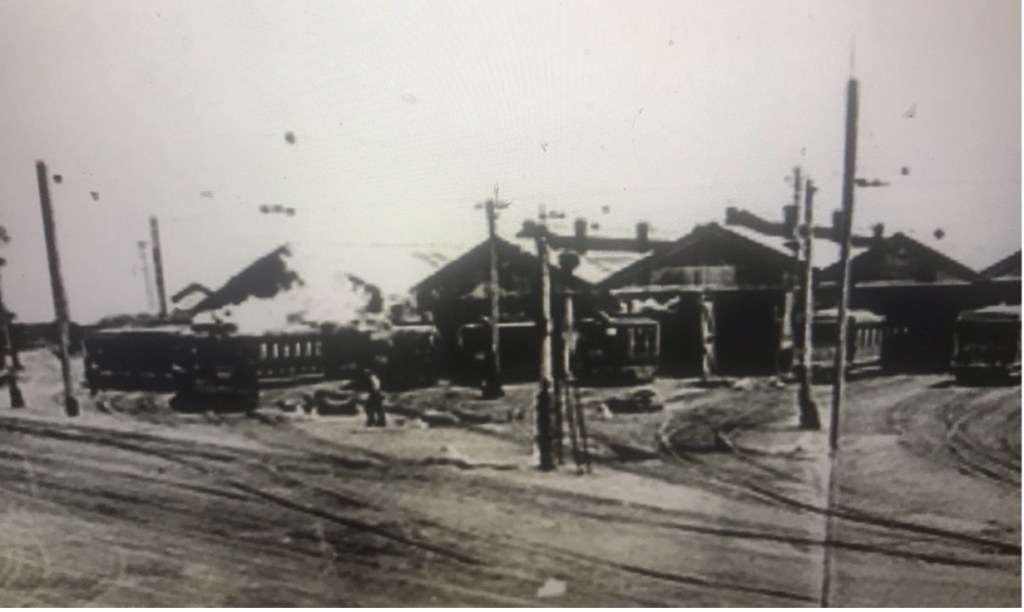 Steam trams at a Newcastle Depot, of a class that would have operated on the proposed Stockton to Salt Ash tramway [Newcastle Library]