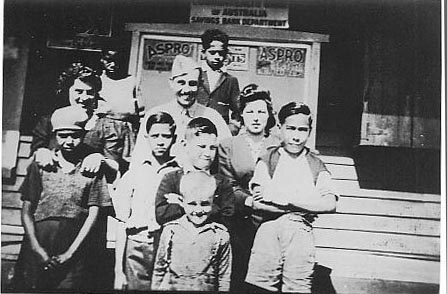 Refugee children from Timor with an American serviceman and two ladies – outside Upton’s Shop at Bobs Farm.