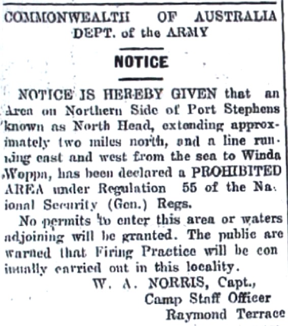 “Councillor Upton reported at last meeting of the Port Stephens Shire Council that the military restrictions on people travelling to Nelson’s Bay had been lifted, and the road was now open.”