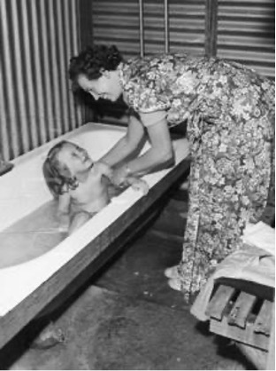 In standard bathroom Mrs Anni-Hermans from Noordwyk Bennen, Holland gives small daughter Nelleke her morning bath.